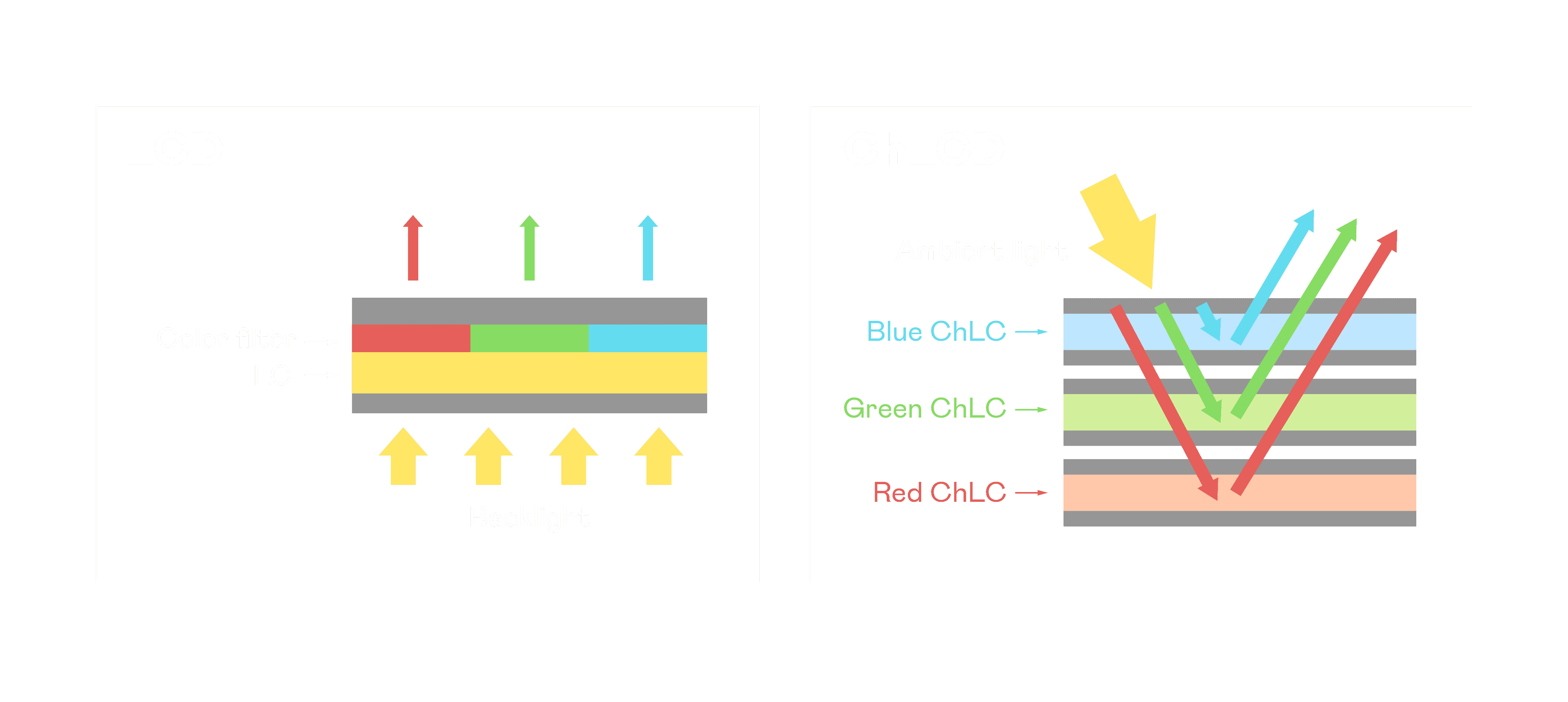 财神娱乐胆固醇液晶显示器是由红、、绿、、、蓝三层胆固醇液晶面板堆叠而成,,,并采用无彩色滤光片设计,,减少环境光在反射过程中的损耗。。。