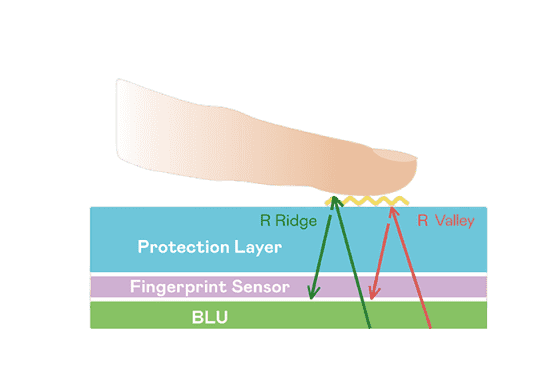 TFT 指纹扫描感测技术利用薄膜电晶体 (TFT) 当作光感测元件,,藉由非晶硅 (a-Si) 与低温多晶硅(LTPS)既有光电转换特性对不同波段光源进行吸收,,使感测 IC 读取阵列感测元件的光漏电差异,,转换成数位灰阶影像。。