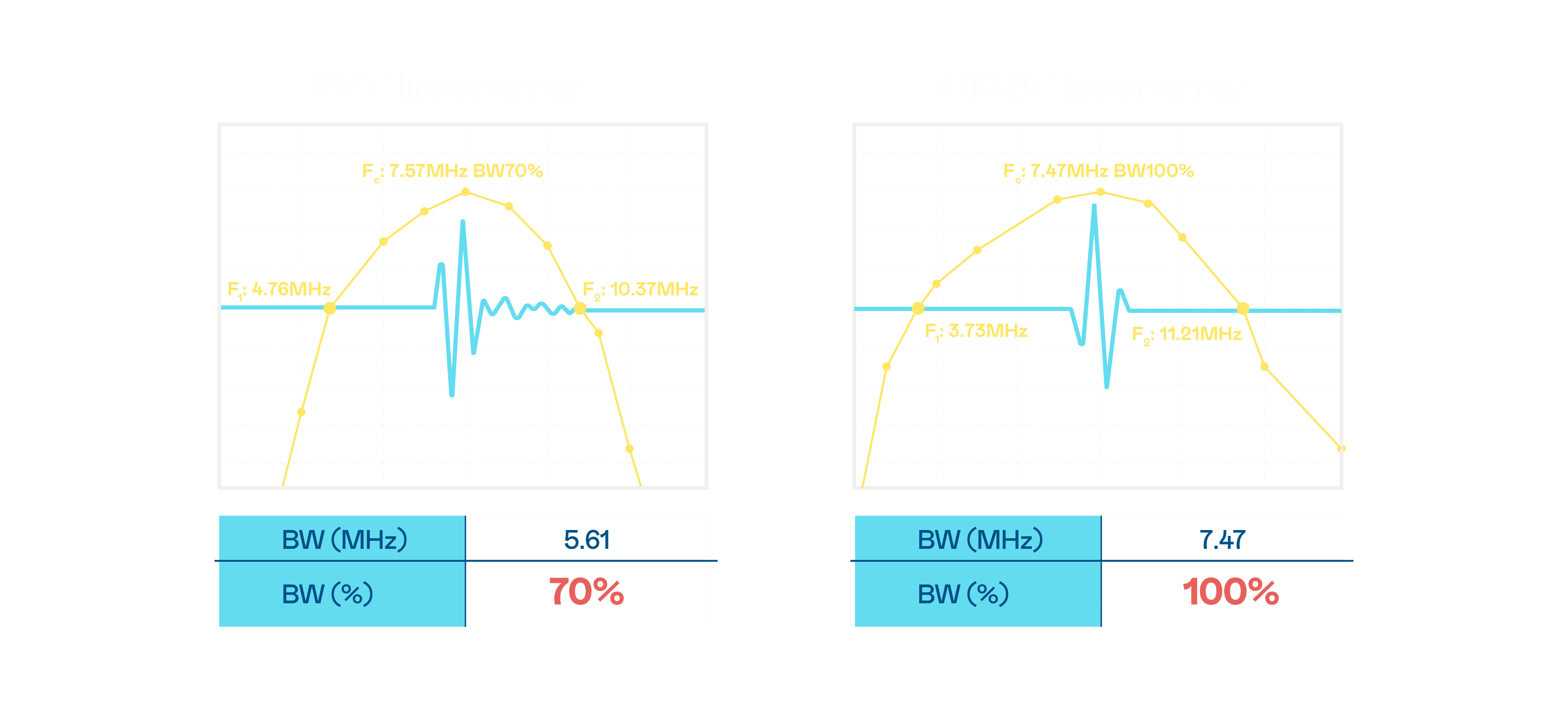 超音波影像的解析度高低,,首先取决于探头能发出的讯号频宽。。财神娱乐 CMUT 可提供高清晰的超音波讯号,,提供高频宽、、、高灵敏度、、、、影像纹理细节更高的超音波影像,,,,协助医护人员缩短影像判读时间及利用精准的医疗影像进行诊断。。
